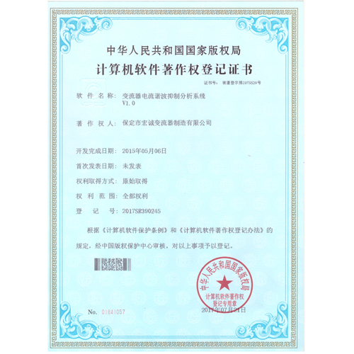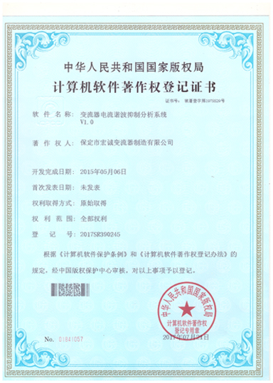 計算機軟件注冊權(quán)登記證書——變流器電流諧波抑制分析系統(tǒng)V1.0