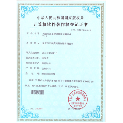 計算機軟件注冊權(quán)登記證書——光伏變流器實時數(shù)據(jù)檢測系統(tǒng)V1.0
