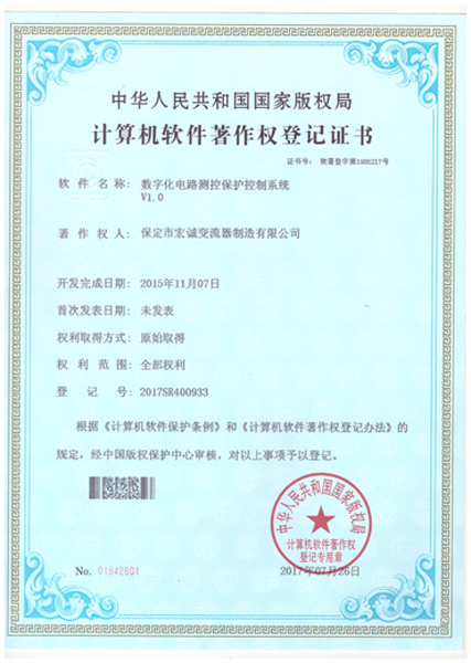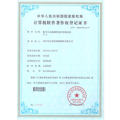 計算機軟件注冊權(quán)登記證書——數(shù)字化電路測控保護控制系統(tǒng)V1.0